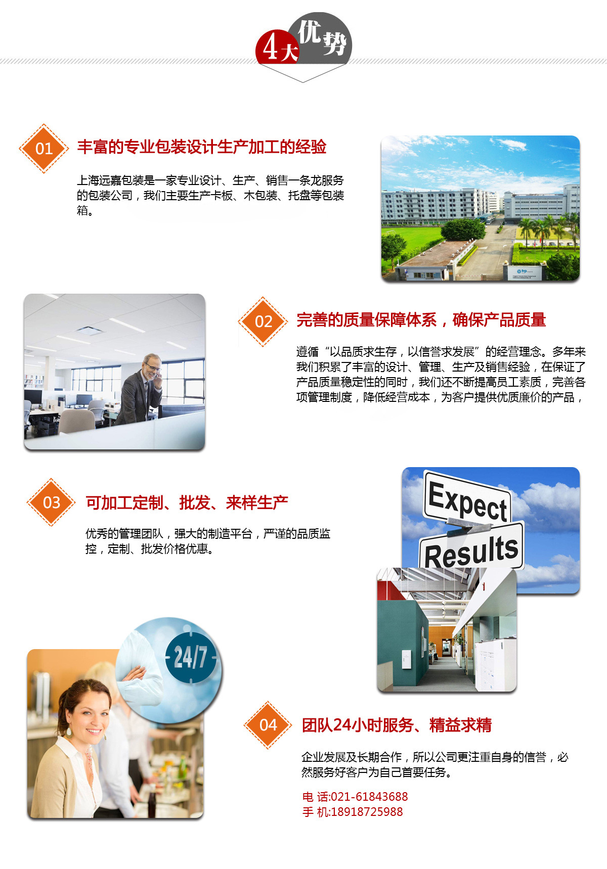 上海遠嘉包裝技術有限公司擁有數年包裝設計生產經驗。為客戶設計定制各類出口包裝箱,木箱包裝,免熏蒸包裝箱,鋼帶箱,扣件包裝箱,花格箱,大型設備包裝箱,實木熏蒸包裝箱,木托盤,熏蒸及免熏蒸托盤,熱縮膜包裝等。